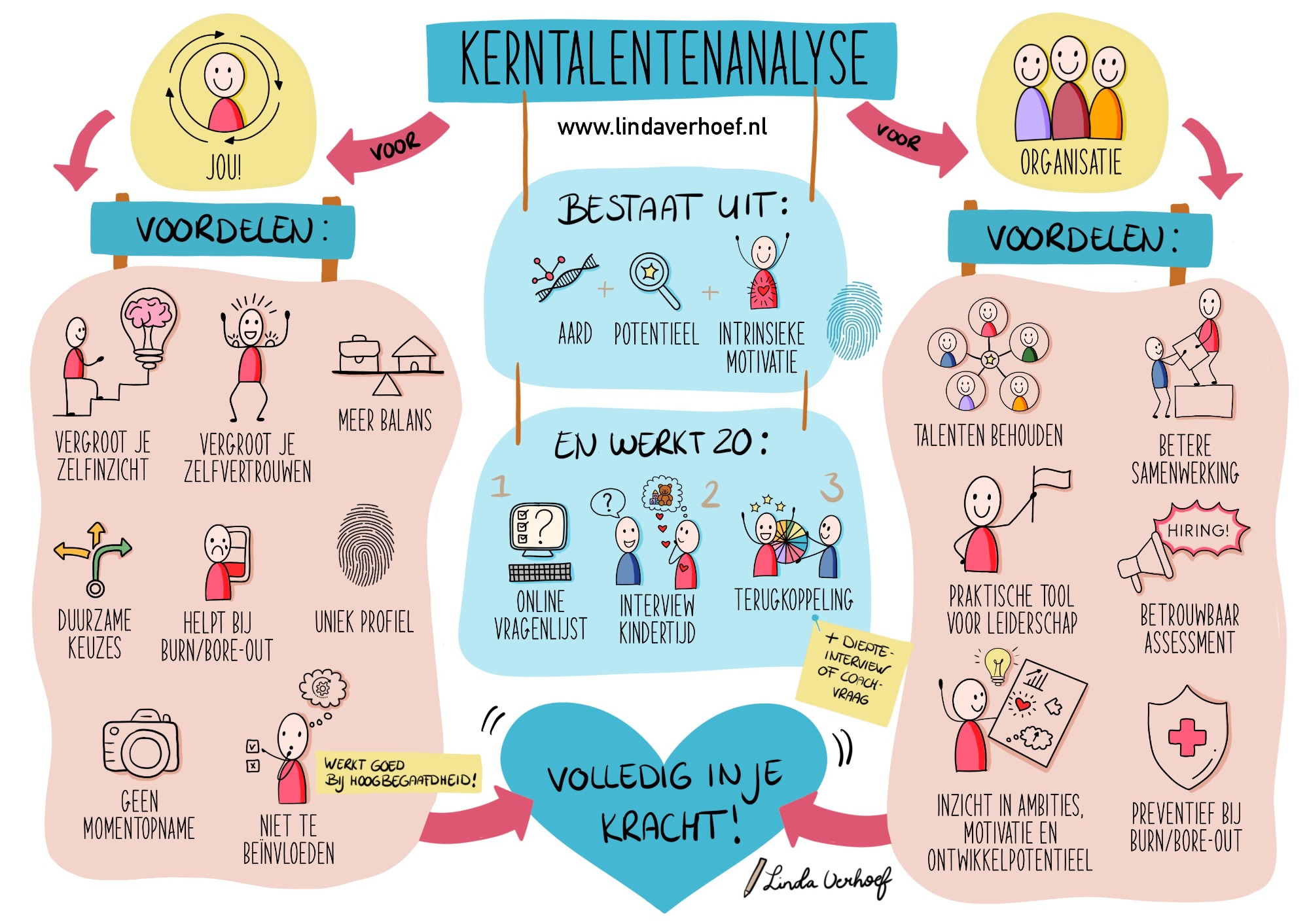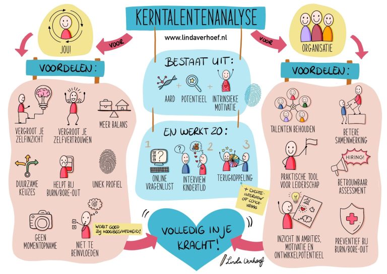 Jouw kerntalentenanalyse brengt jouw aard, je intrinsieke motivatie én je potentieel in beeld. Het is een soort kompas dat je overal voor kunt gebruiken. Het maakt namelijk inzichtelijk wat jou van nature drijft, waar je energie van krijgt én wat je graag aan anderen overlaat.